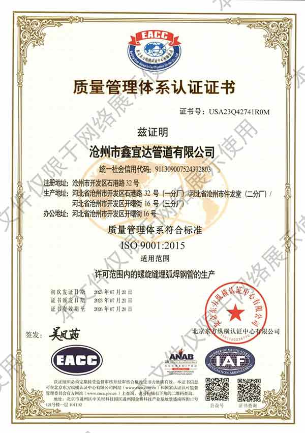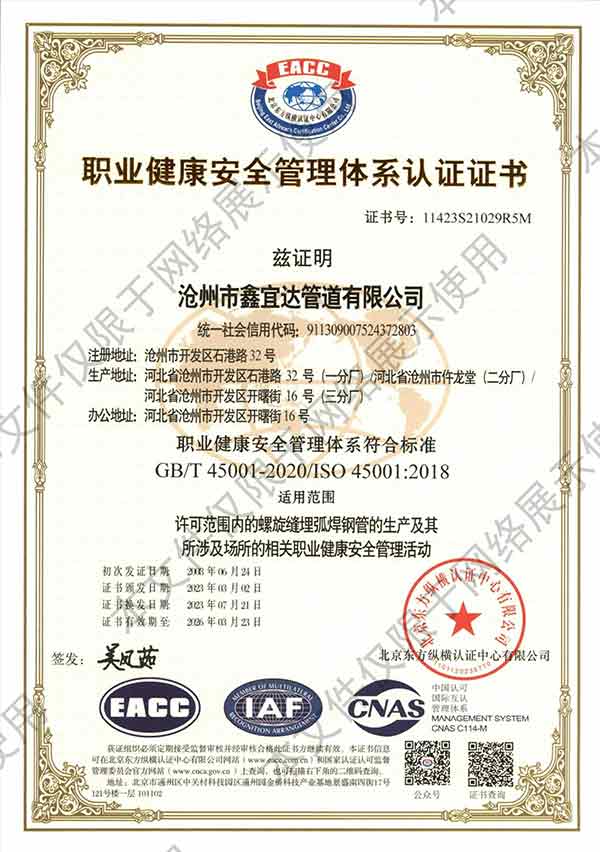 滄州市鑫宜達(dá)管道有限公司成立于2003年7月,坐落于滄州經(jīng)濟(jì)開(kāi)發(fā)區(qū),占地面積40萬(wàn)平方米,注冊(cè)資金1.81億元,是集螺旋鋼管生產(chǎn)、防腐加工以及無(wú)縫鋼管、卷板、帶鋼等品類鋼材經(jīng)營(yíng)銷售于一體的工貿(mào)型企業(yè)。公司現(xiàn)有員工400多人,其中,中高級(jí)技術(shù)職稱的人員達(dá)120余名。 滄州市鑫宜達(dá)管道有限公司擁有9條螺旋鋼管生產(chǎn)線和3PE防腐生產(chǎn)線,可生產(chǎn)直徑219--3640mm,壁厚5.5--28mm,最高鋼級(jí)X100的各種規(guī)格防腐螺旋鋼管...